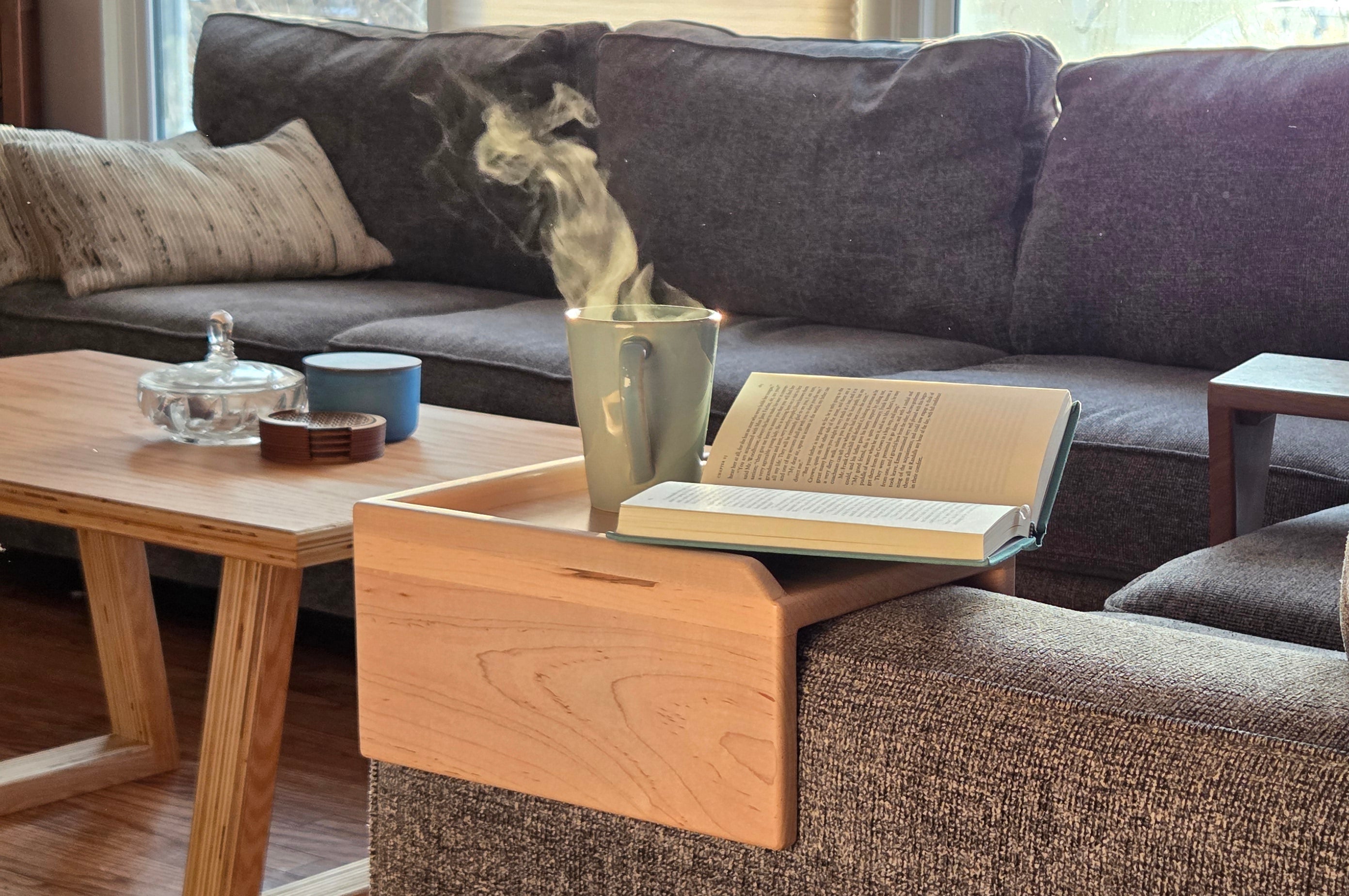 A longer version of our classic sofa arm table, offering extra room for plates, laptops, or décor. Each is handmade to your custom specifications in solid hardwood.